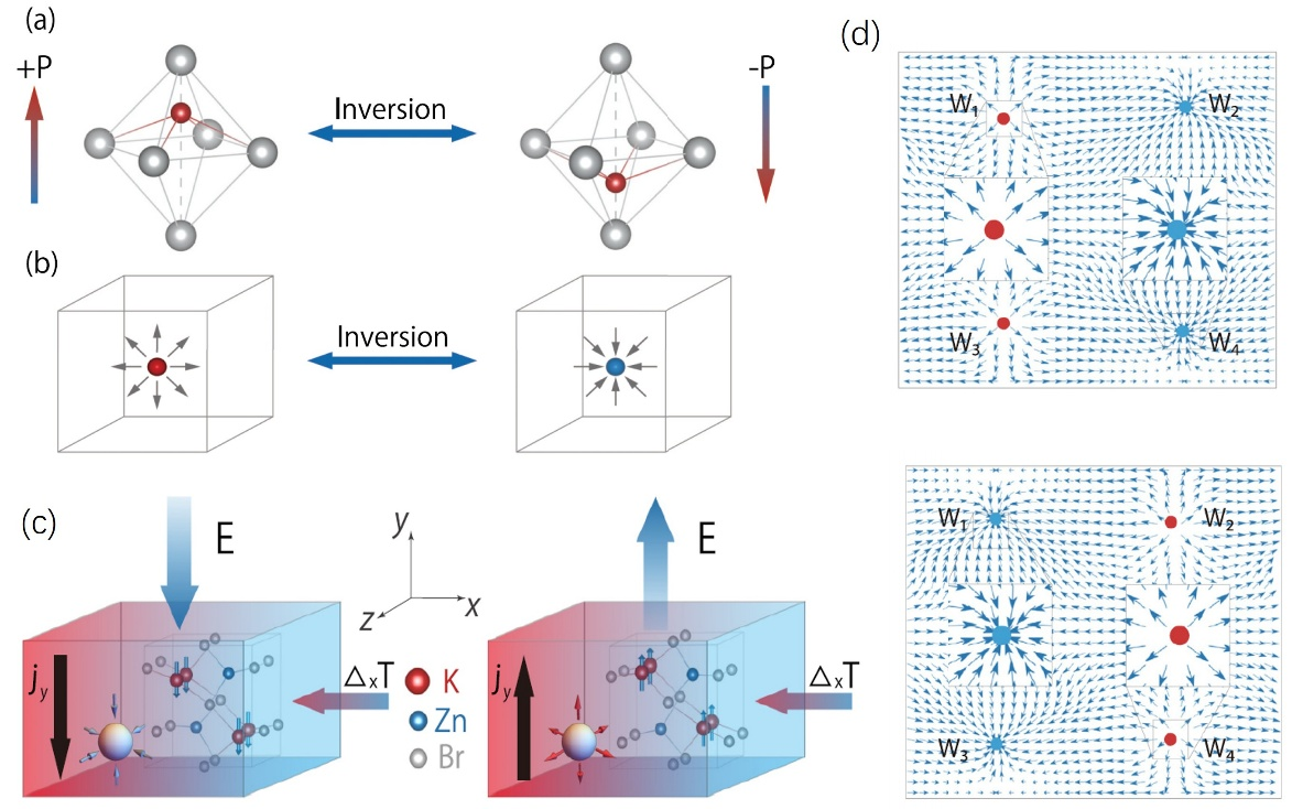 图1:(a)-(b)铁电极化切换外尔准粒子手性的示意图。 (c) 外尔声子材料中的非线性声子霍尔效应。(d)贝利曲率场随铁电极化的切换。
