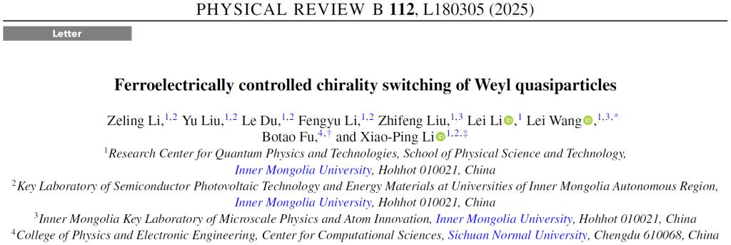近日,我院李小平研究员和王磊研究员在拓扑量子态的操控方面取得重要突破,相关成果以“Ferroelectrically controlled chirality switching of Weyl quasiparticles”为题,以Letter的形式发表于物理学期刊 Physical Review B上。论文链接:https://journals.aps.org/prb/abstract/10.1103/mrls-4v3d。李小平研究员、王磊研究员与四川师范大学付波涛副教授为共同通讯作者,博士生李泽玲为第一作者,9728太阳集团为论文第一完成单位。